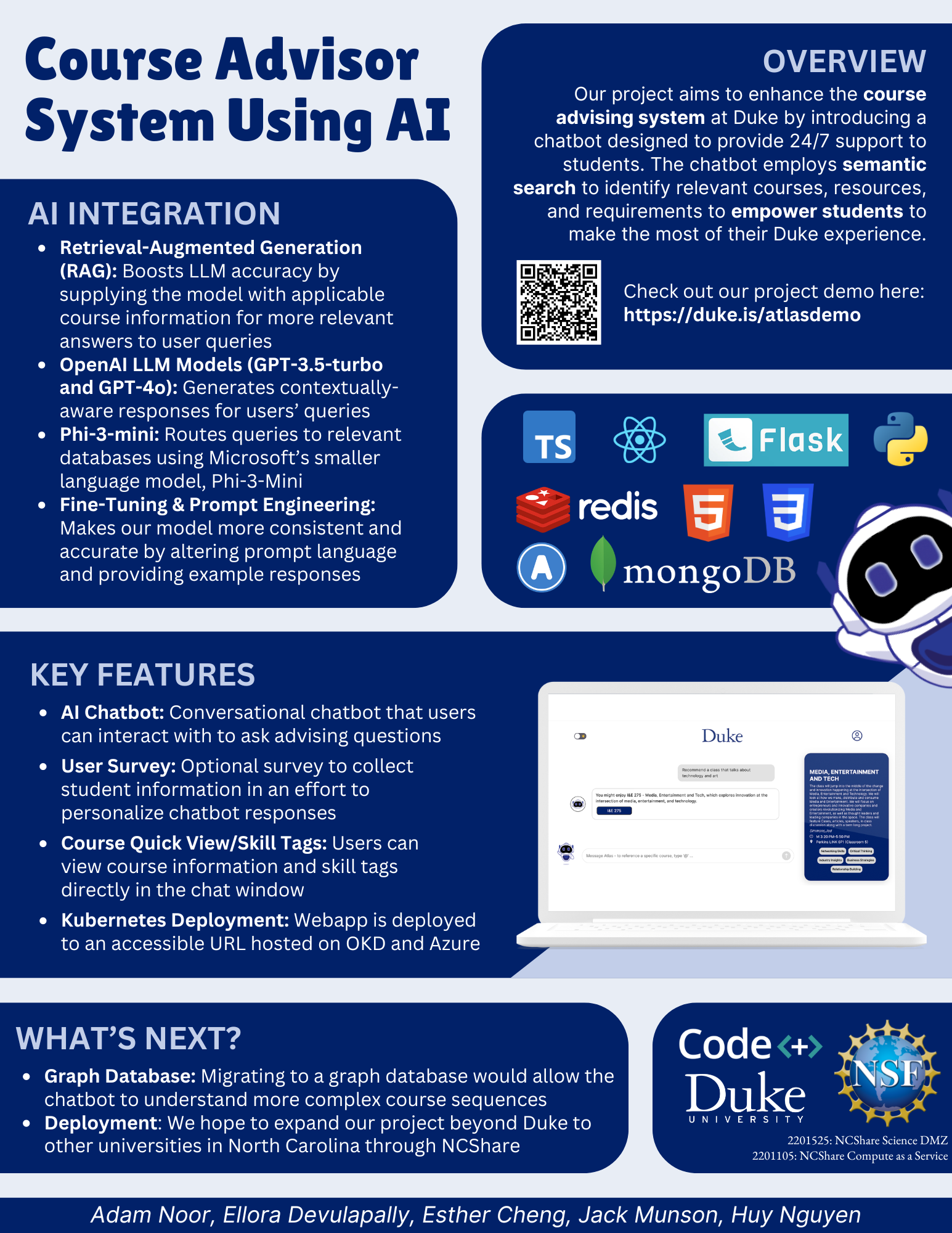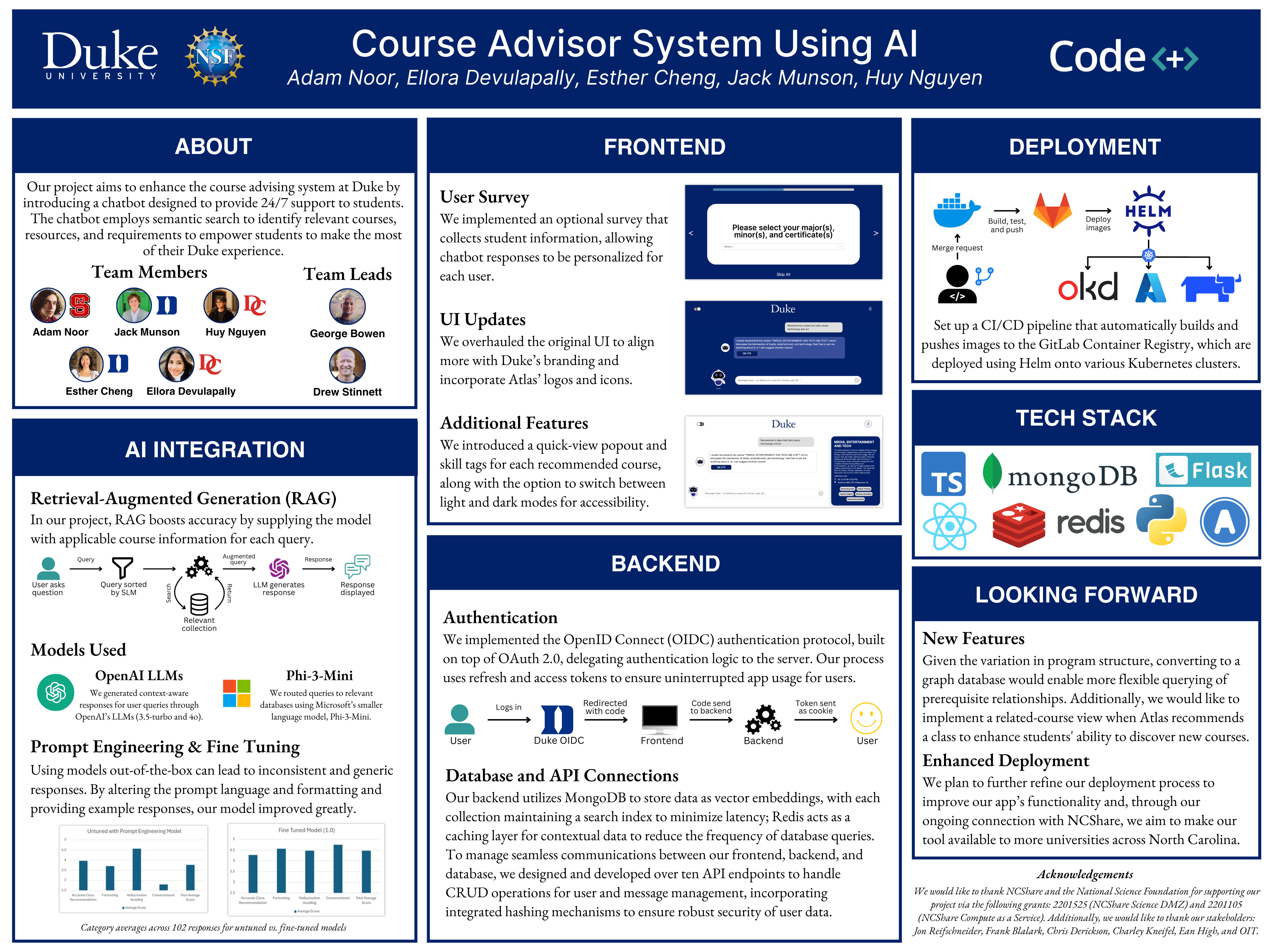 Our project integrated Duke's course catalog with a fine-tuned version of OpenAI's gpt-3.5-turbo model. We semantically searched our database for vector representations closest to the user's query (RAG) to generate relevant courses. Throughout the summer, we worked closely with the Duke University Registrar and the Academic Advising Center to make a tool that was accessible, useful, and accurate for students and advisors alike.